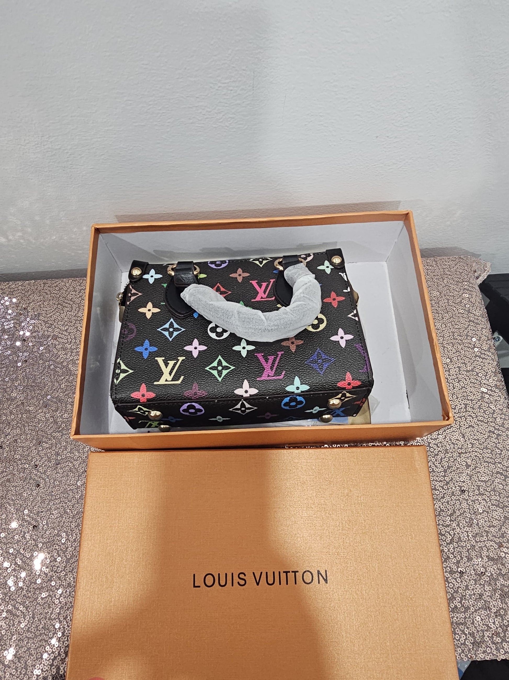The bag is finished with gold-tone hardware, and the edges and handles feature contrasting leather-style trim. It comes presented in a Louis Vuitton-branded orange box, as seen in the images.