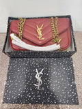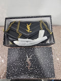 Hardware: Prominent gold-toned YSL monogram and chain strap.