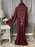 Step into sophistication with this Burgundy Luxe Beaded Abaya, a stunning masterpiece that blends modesty and glamour. The rich burgundy fabric serves as the perfect canvas for intricate hand-embellished beadwork in tones of gold, silver, and bronze, forming elegant floral vine motifs that cascade beautifully across the back and sleeves.