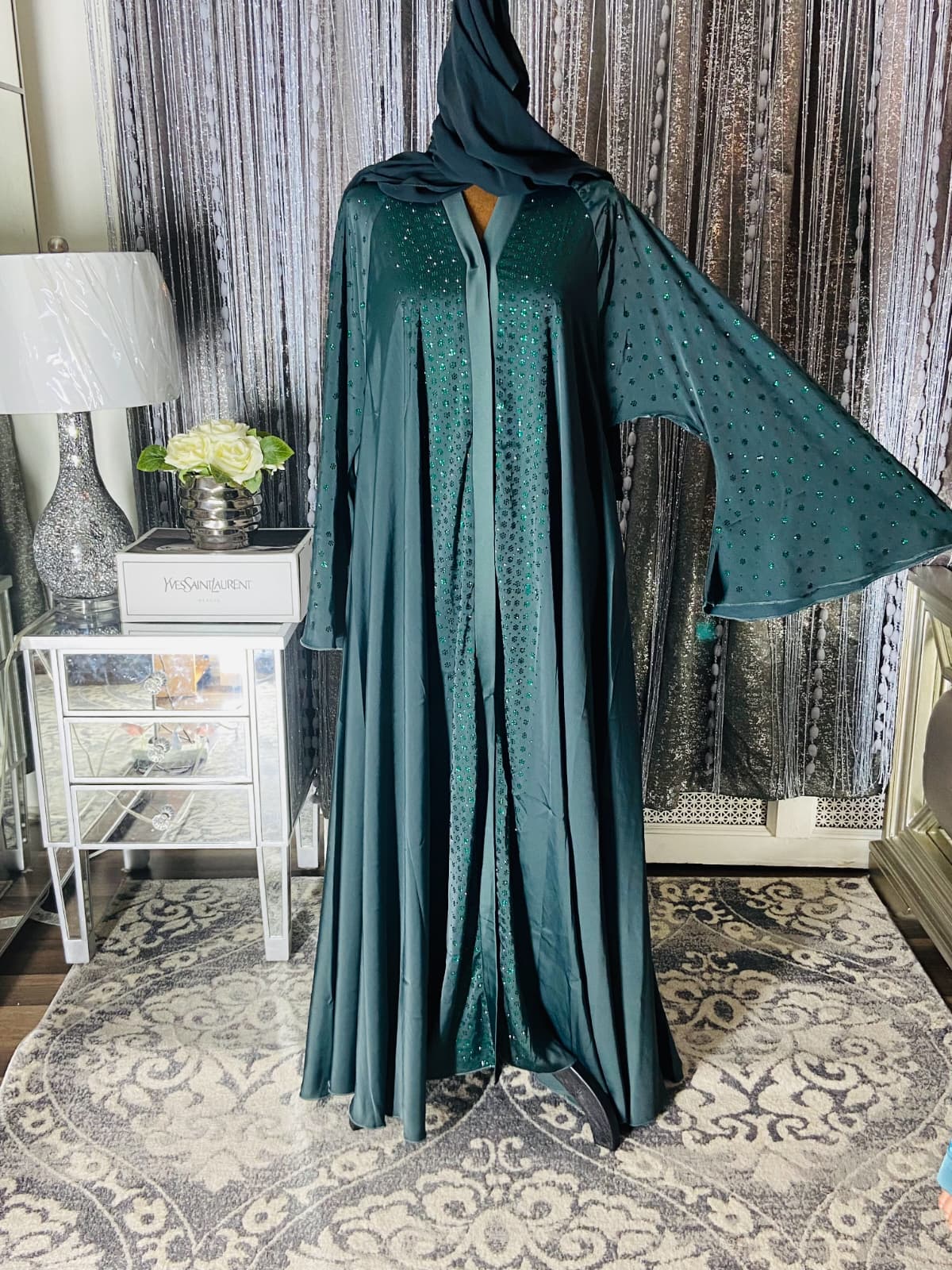 Emerald Green Crystal-Embellished Luxury Abaya with Flowy Kimono Sleeves