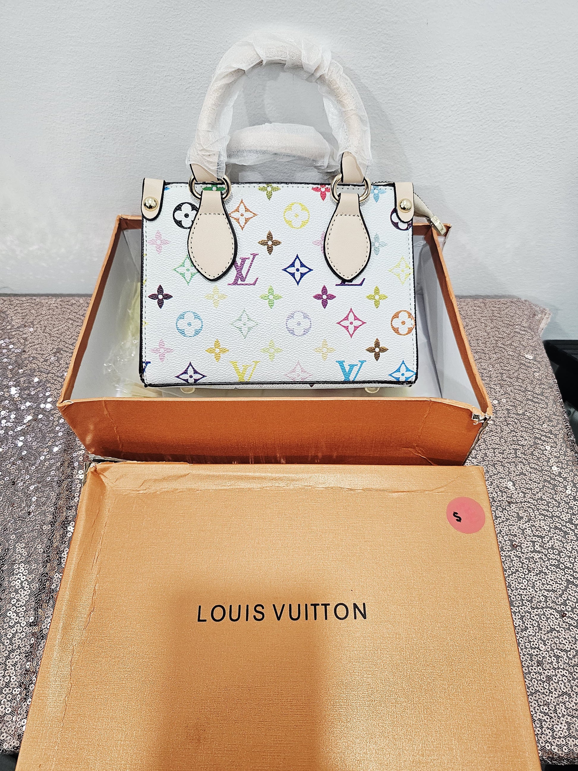 The bag is finished with gold-tone hardware, and the edges and handles feature contrasting leather-style trim. It comes presented in a Louis Vuitton-branded orange box, as seen in the images.
