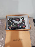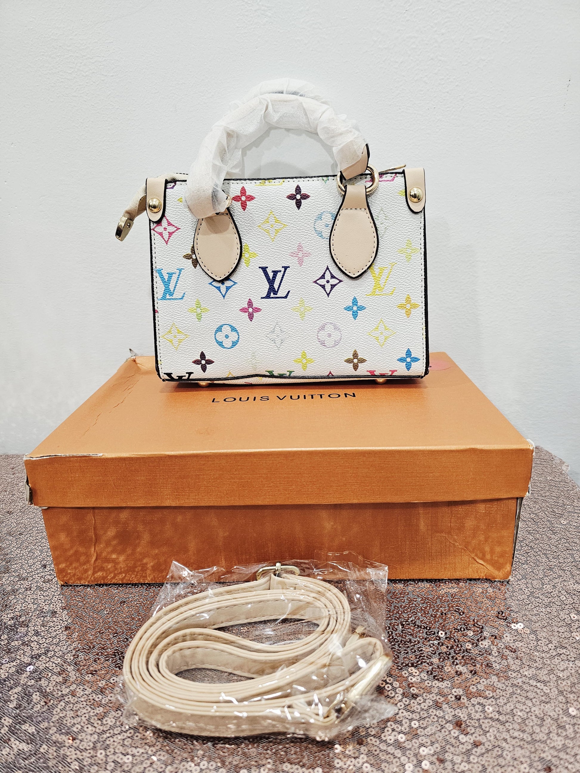 This vibrant and stylish mini handbag is inspired by the Louis Vuitton OnTheGo East West design, featuring a striking Multi-Color Monogram print on a coated canvas-style material. This iconic pattern, created in collaboration with artist Takashi Murakami, features the traditional LV monogram and motifs in a playful spectrum of colors.