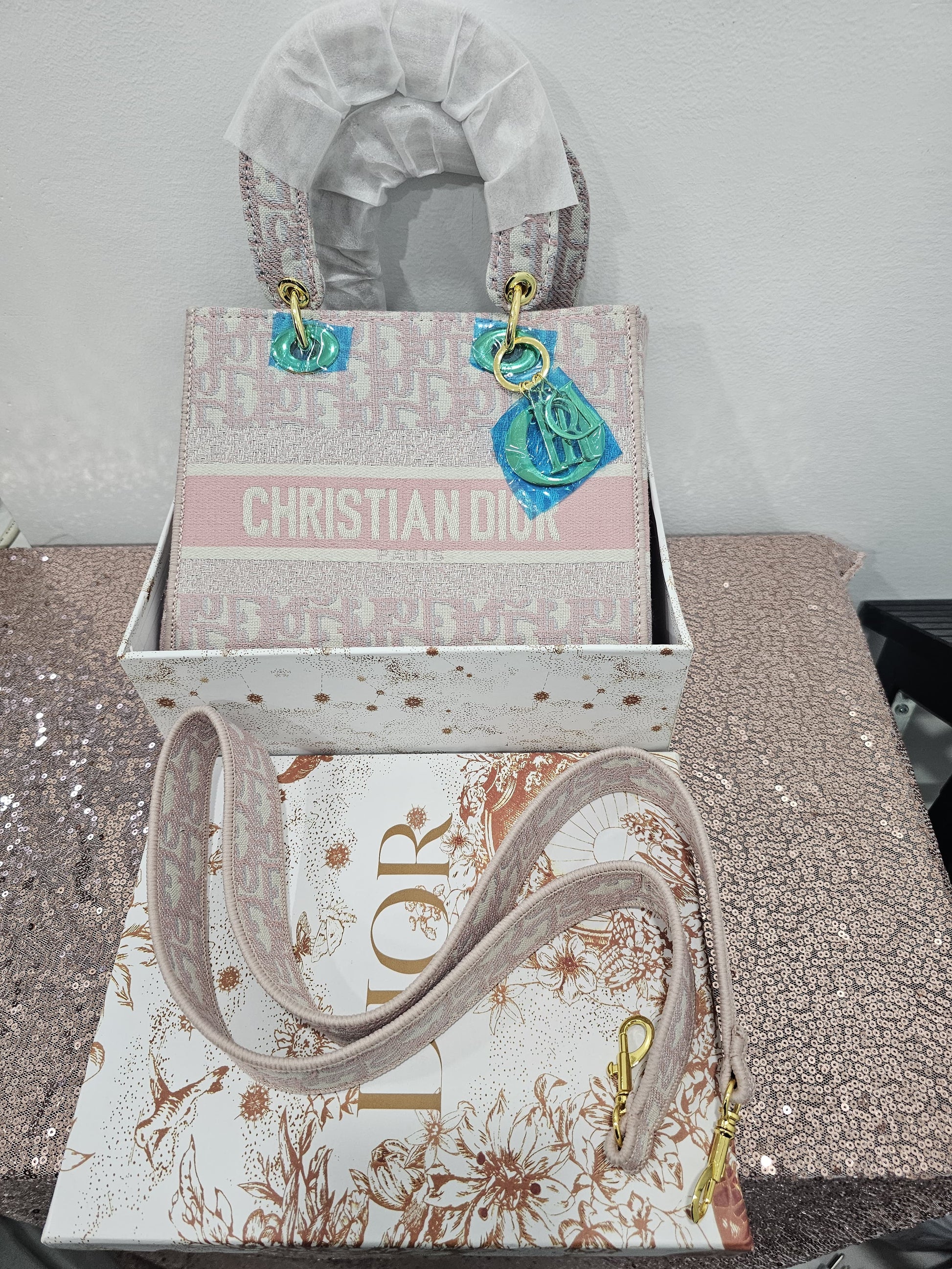 A key design feature is the thick, contrasting "CHRISTIAN DIOR" logo band embroidered across the center front. The bag includes structured top handles (wrapped for protection) and may be worn as a hand-carry or elbow bag. On one variant (Pink), a matching adjustable and detachable shoulder strap is included, allowing for comfortable crossbody or shoulder wear.