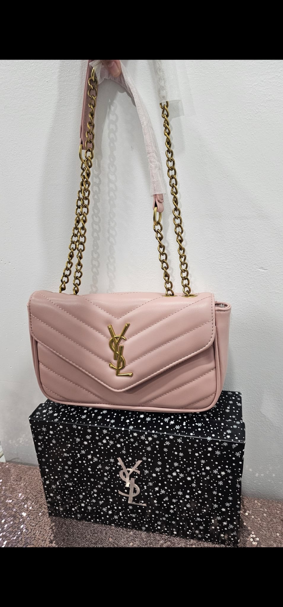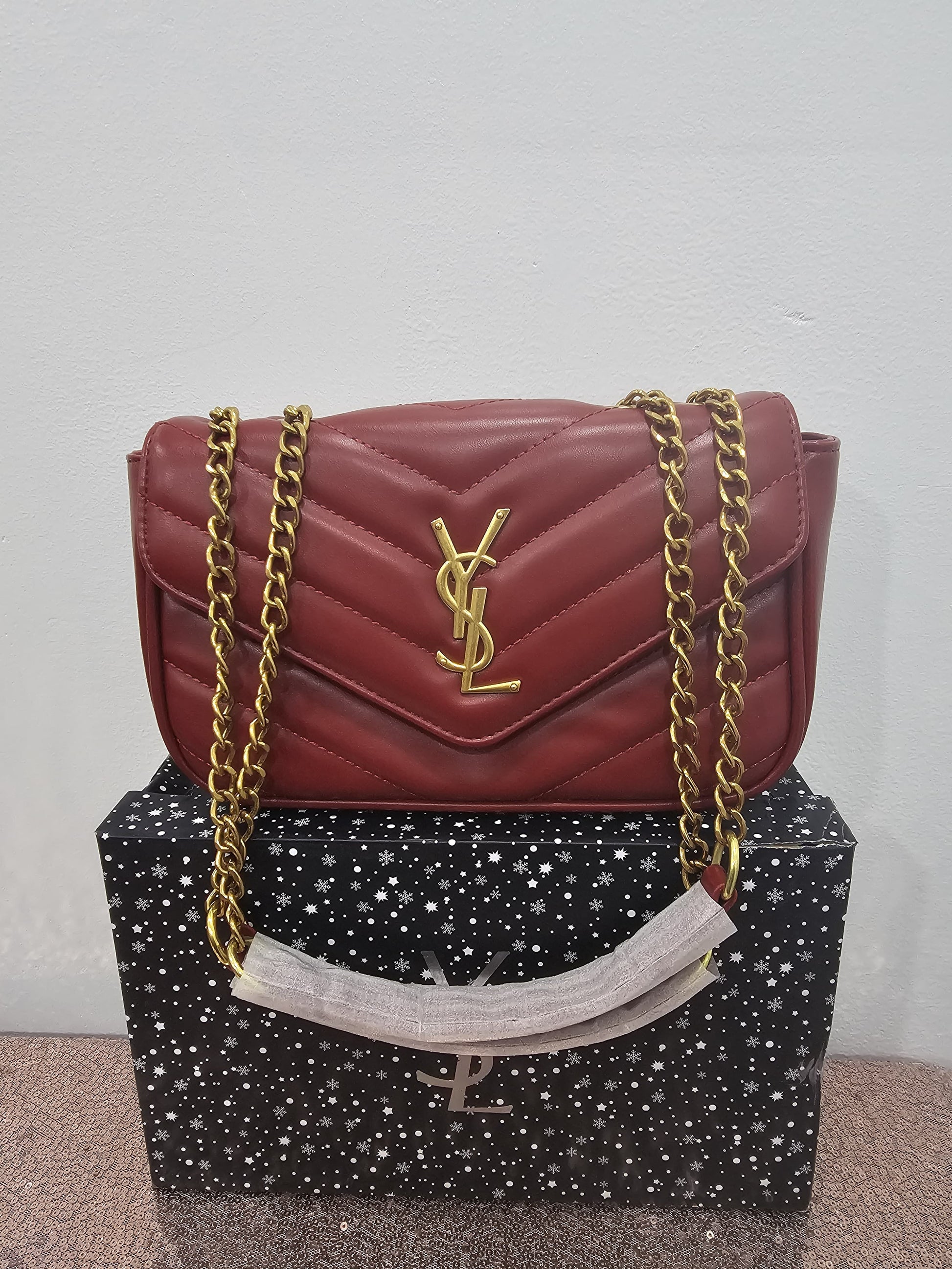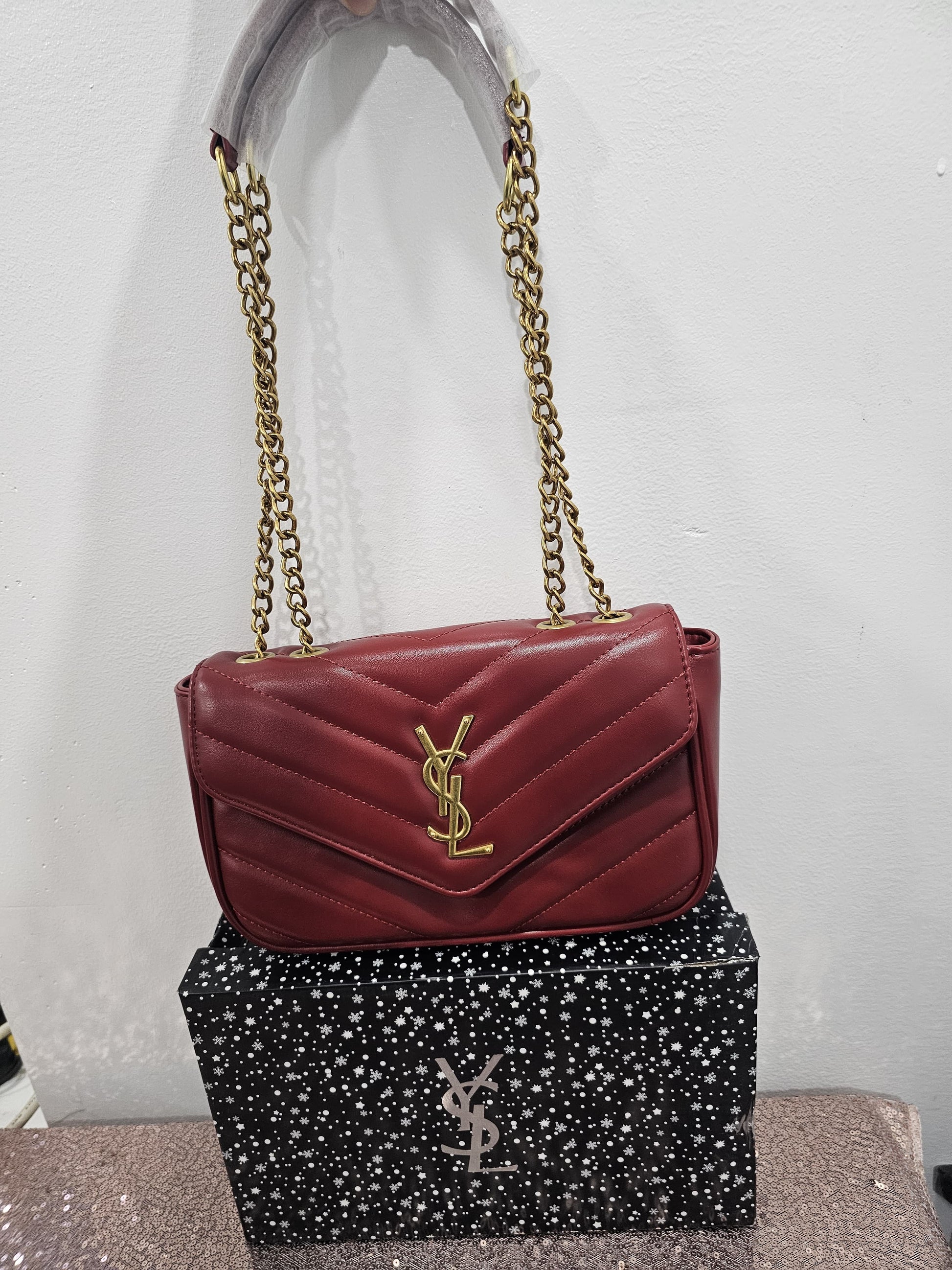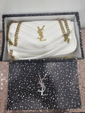 Hardware: Prominent gold-toned YSL monogram and chain strap.