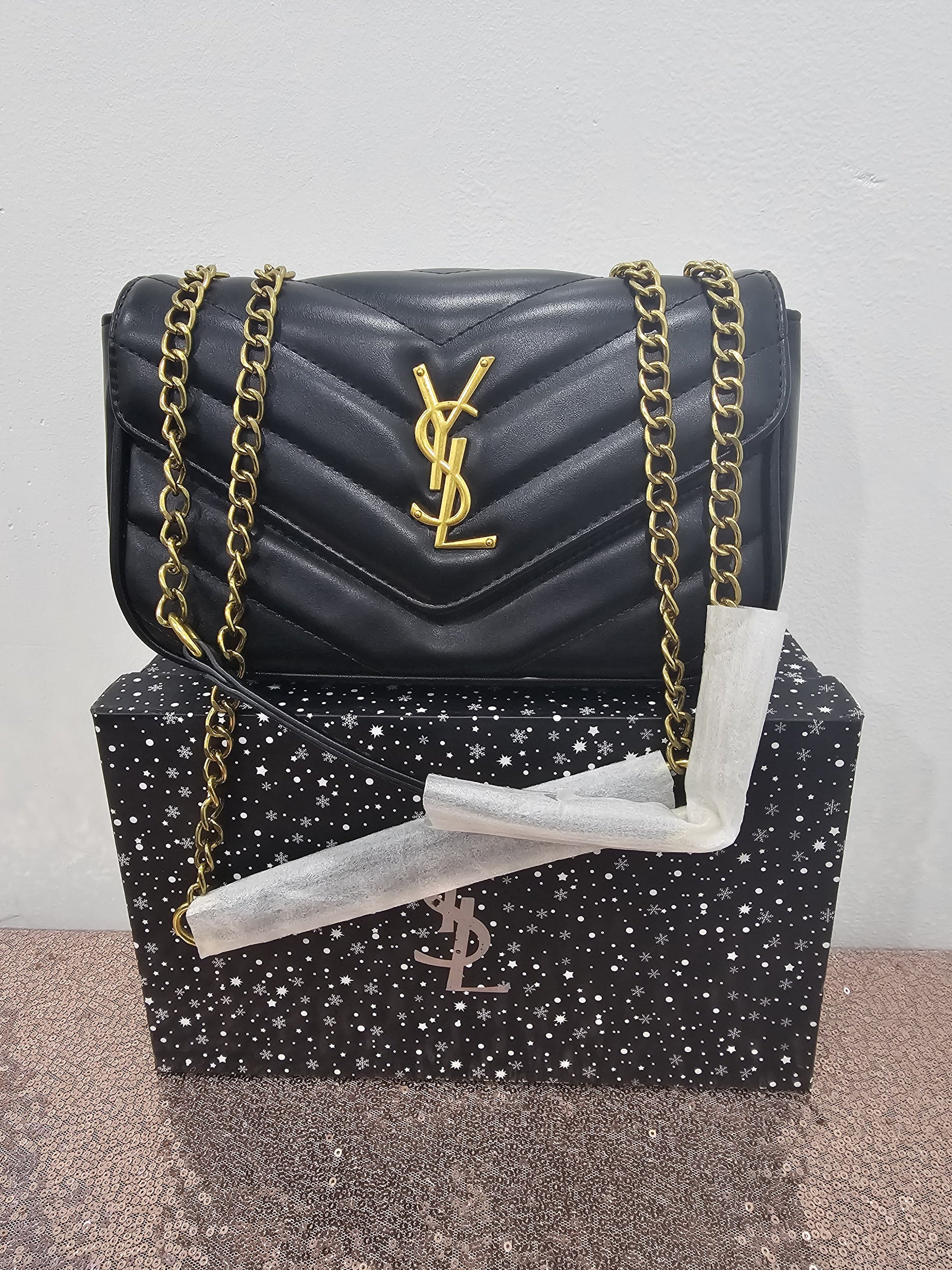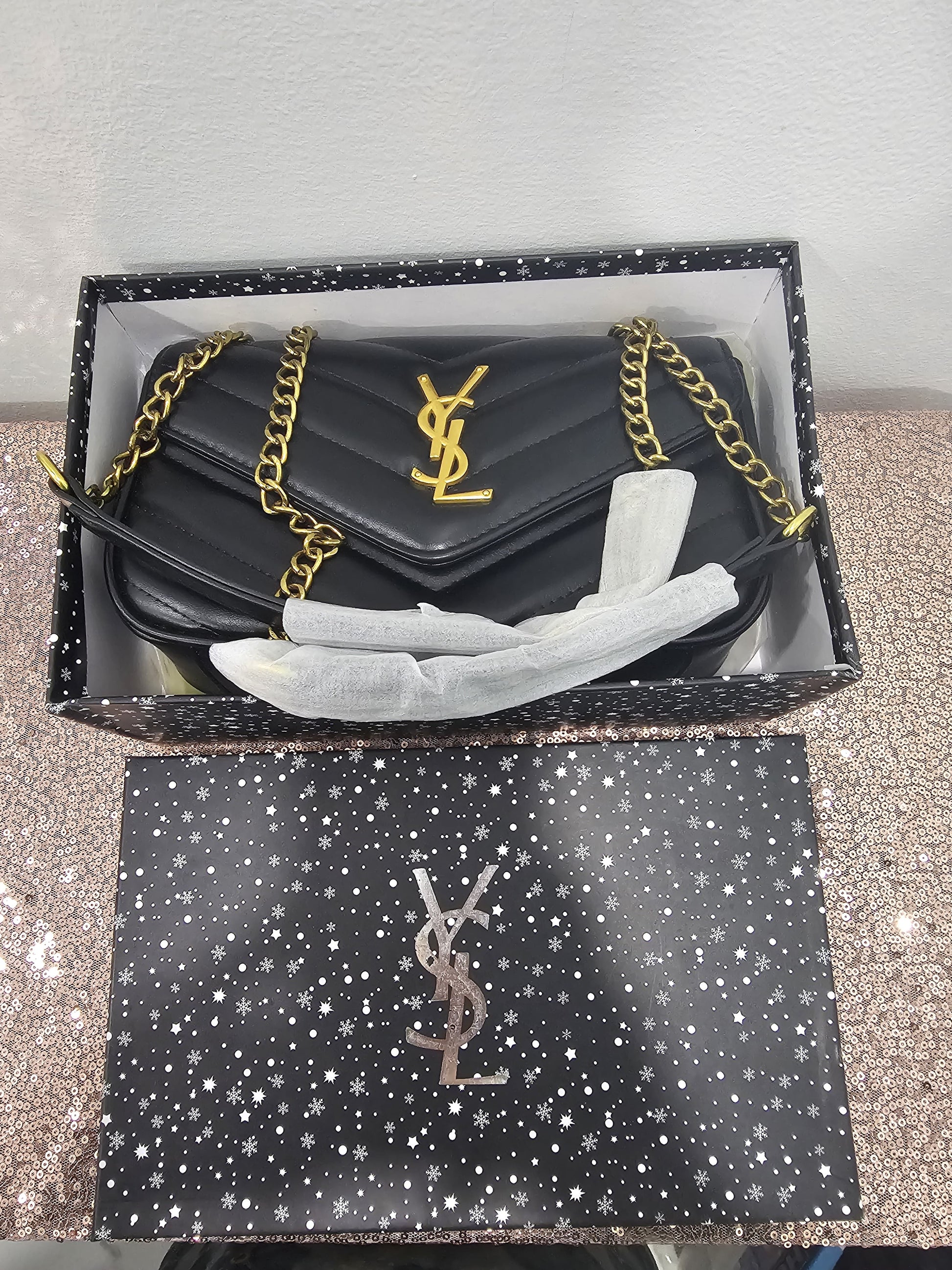 The bag is instantly recognizable by the prominent gold-toned YSL monogram hardware on the front flap, which serves as the centerpiece. It includes a versatile gold-tone chain strap that allows for various carrying options, either doubled up as a shoulder bag or worn long as a crossbody, with a comfortable leather or matching material insert at the shoulder. The flap closure keeps your essentials secure.